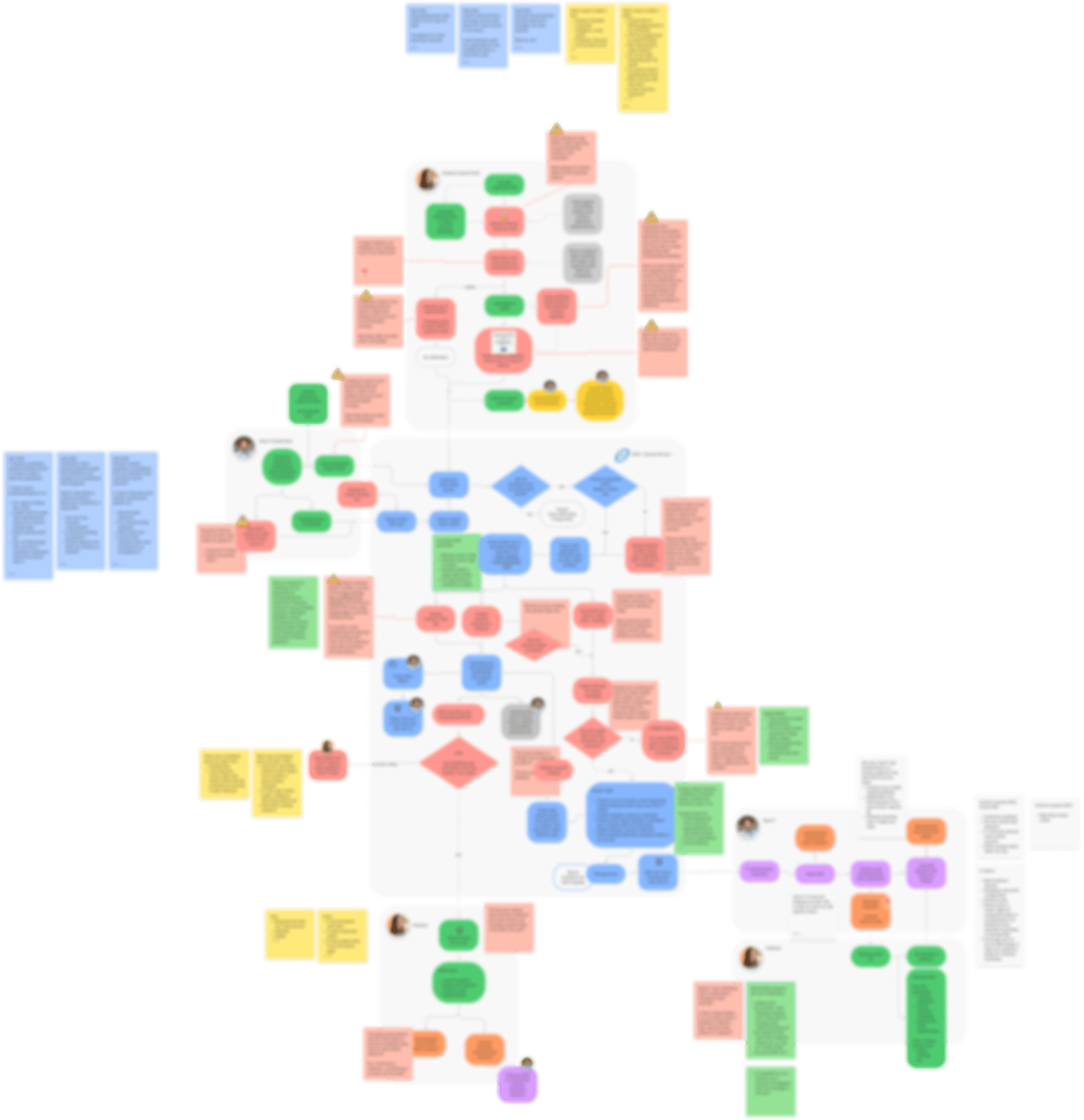 A blurred preview of the flow diagram I co-created with developers and cyber secuirty analysts. This begins with an employee feeling like an email is suspicious and explores all the paths, outcomes, users, and processes that could occur. Laying the service out allowed us to spot pain points and bugs more easily (show in red. Lots of red.)
