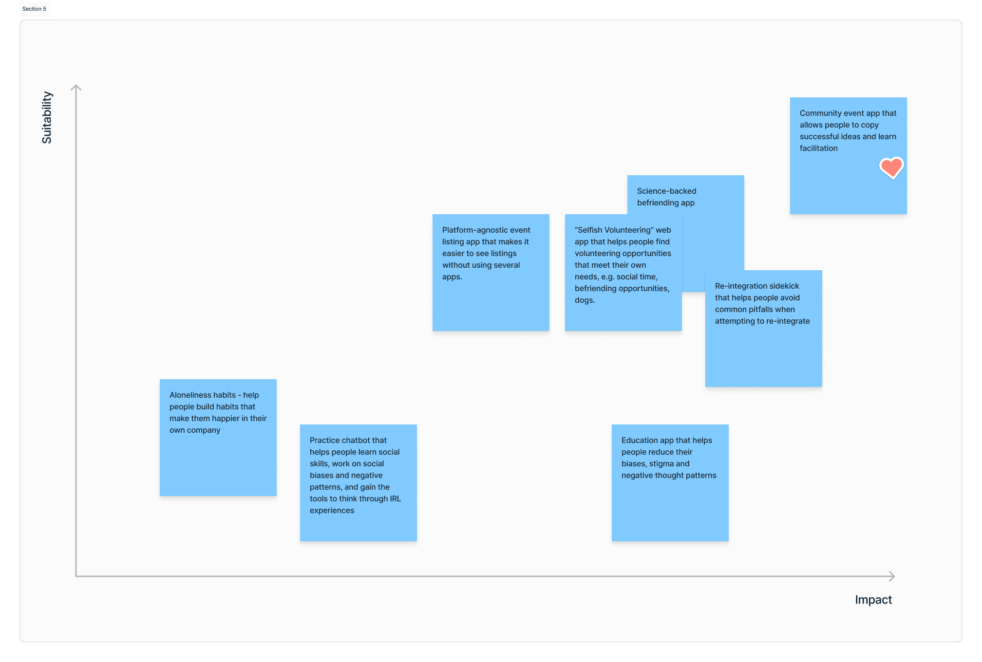 I ideated potential solutions, ranging from a volunteer job listing page that uses specific social benefits to market jobs, to a befriending sidekick that helps users see where their lonely brain might be misleading them.
