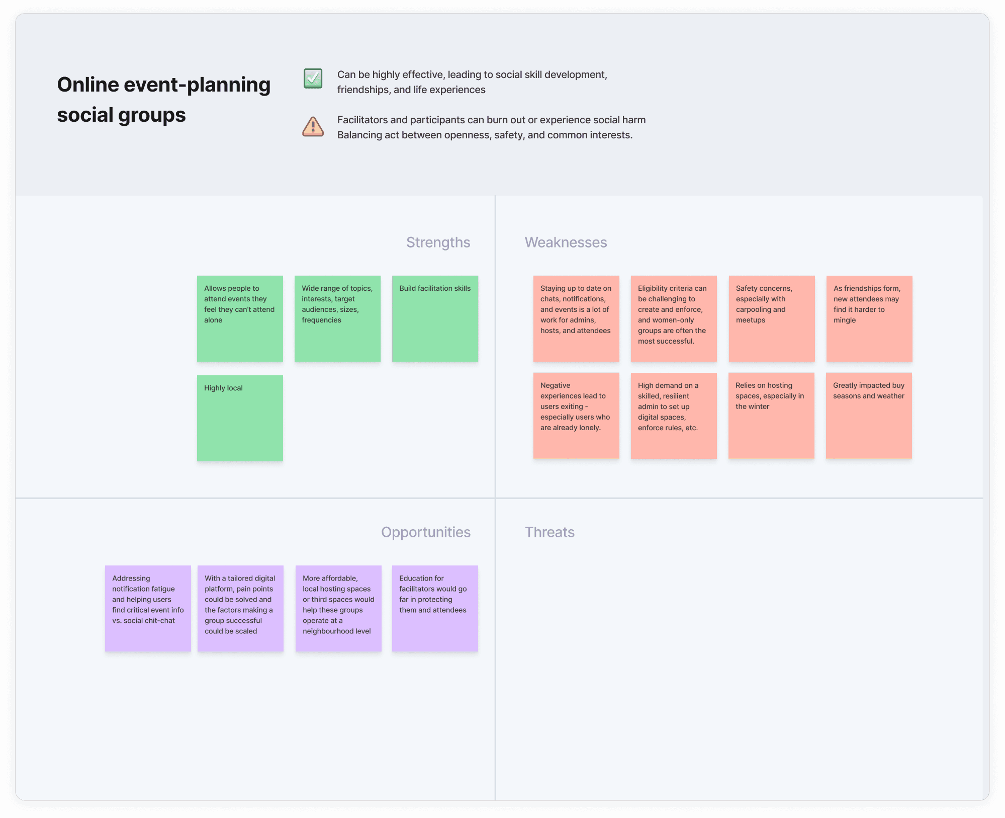 These FigJam notes (blurred for privacy) were taken during phone and in-person interviews. I collected information about what drove participants to seek change, current loneliness levels, desired social circles, and experience with tools and solutions. I also conducted more casual discussions at social meetups, seeking information about how people found the group and how it impacted their loneliness.
