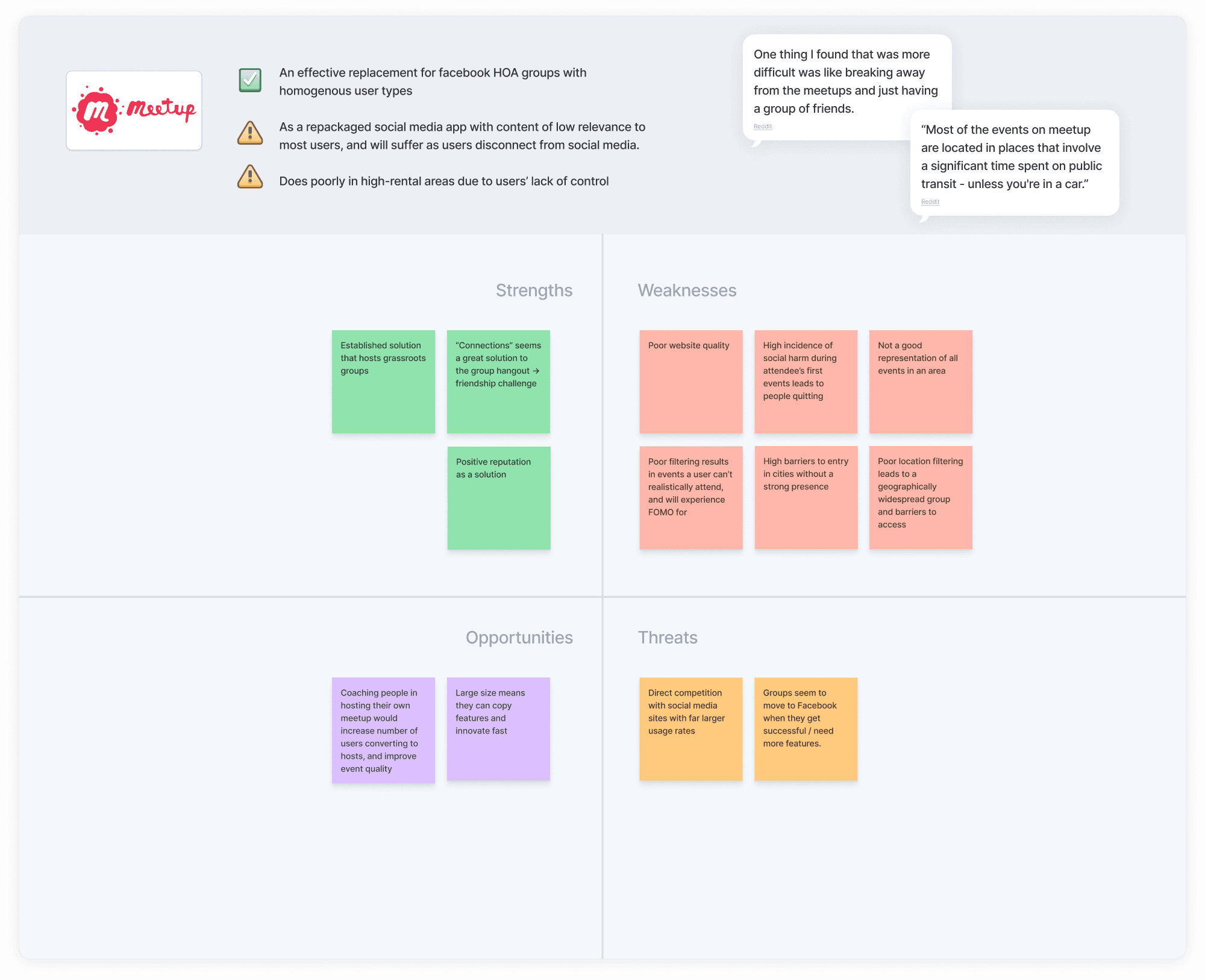 Due to the risk of causing social harm to already-vulnerable participants, usability testing was not part of my process. Doing this safely would involve working with a larger team and returning to the initial hypothesis: does making meetups easier to facilitate result in a less lonely neighbourhood? How do centralized meetups compare to neighbourhood events?