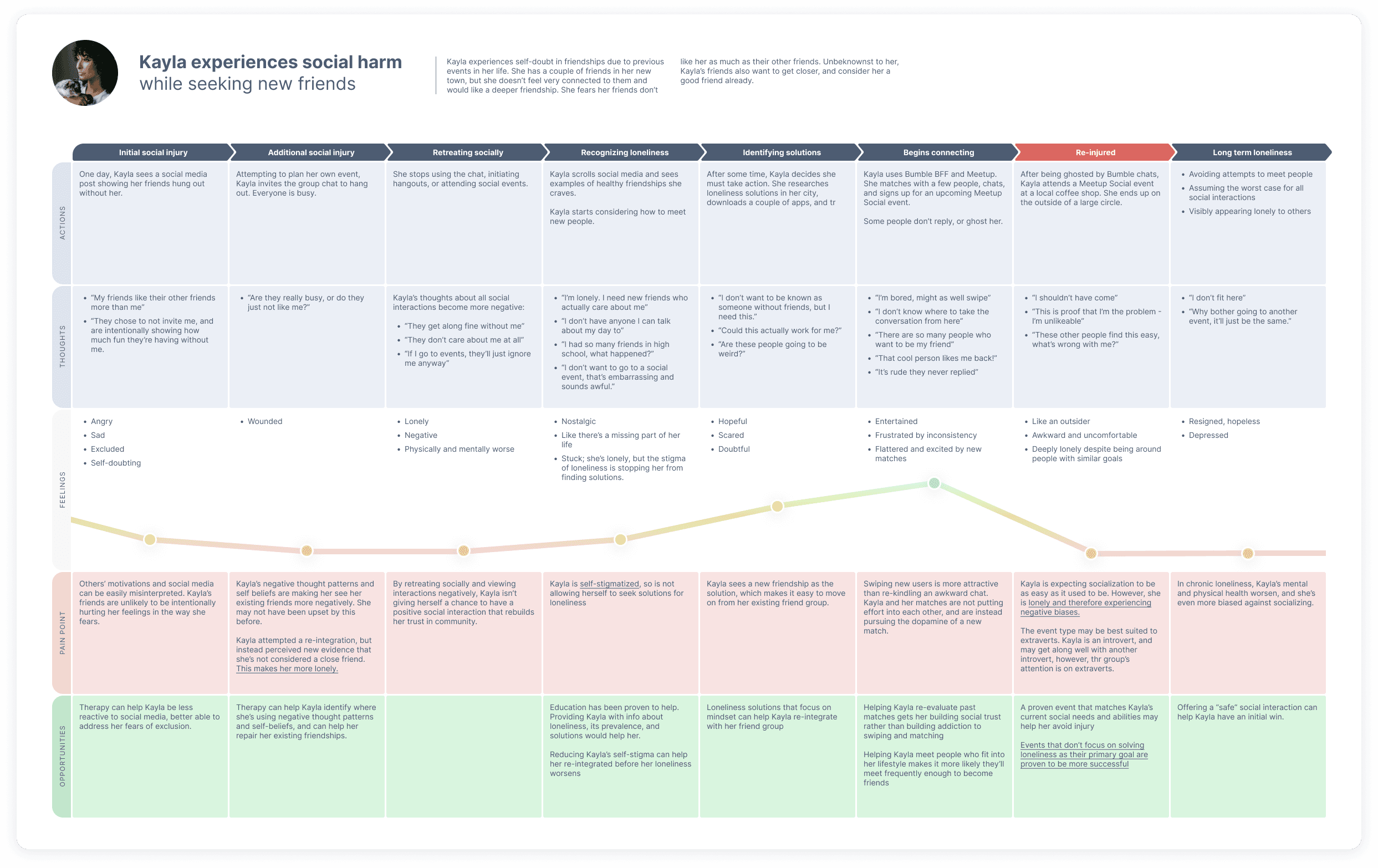This journey map shows an example of a failed loneliness solution making Kayla chronically lonely. A misinterpreted social interaction with her friends triggers initial feelings of loneliness. She seeks solutions that connect her to social meetups and friend candidates. Unfortunately, due to loneliness’ impact on her and the types of re-integration she chooses, Kayla experiences more social harm and falls into chronic loneliness. (Sorry, Kayla 😢)