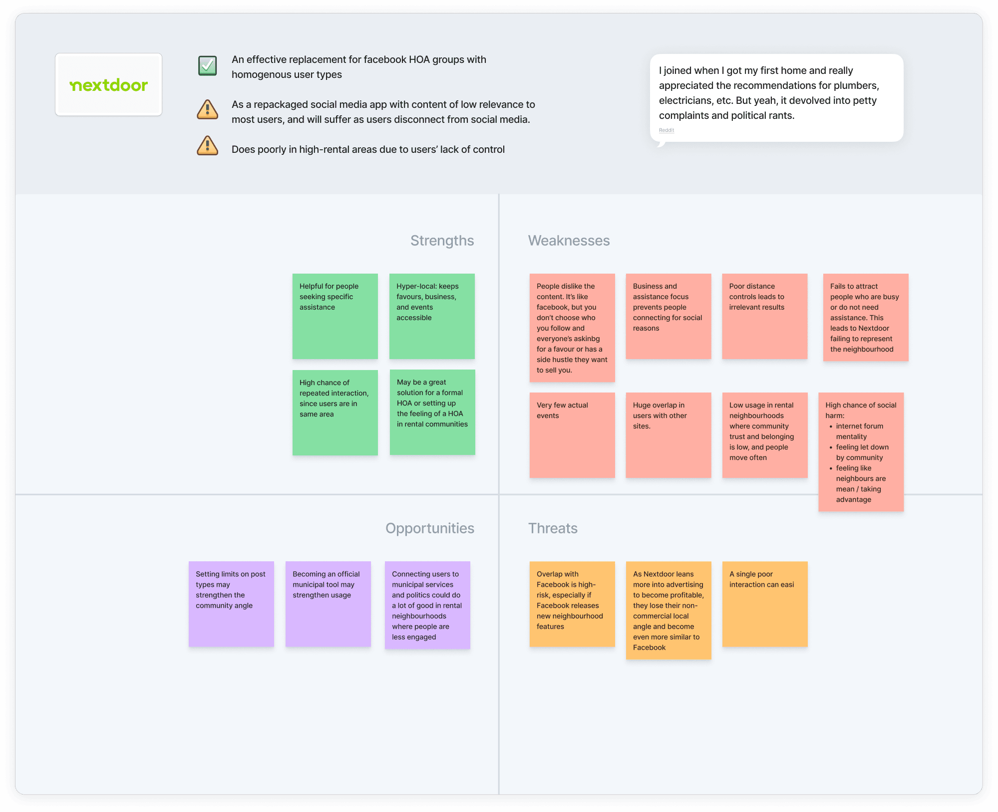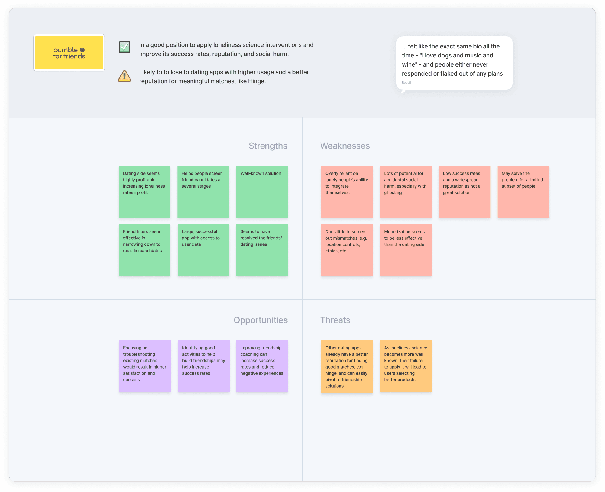 SWOT analyses of top loneliness solutions, based on my interviews, research, and testing.