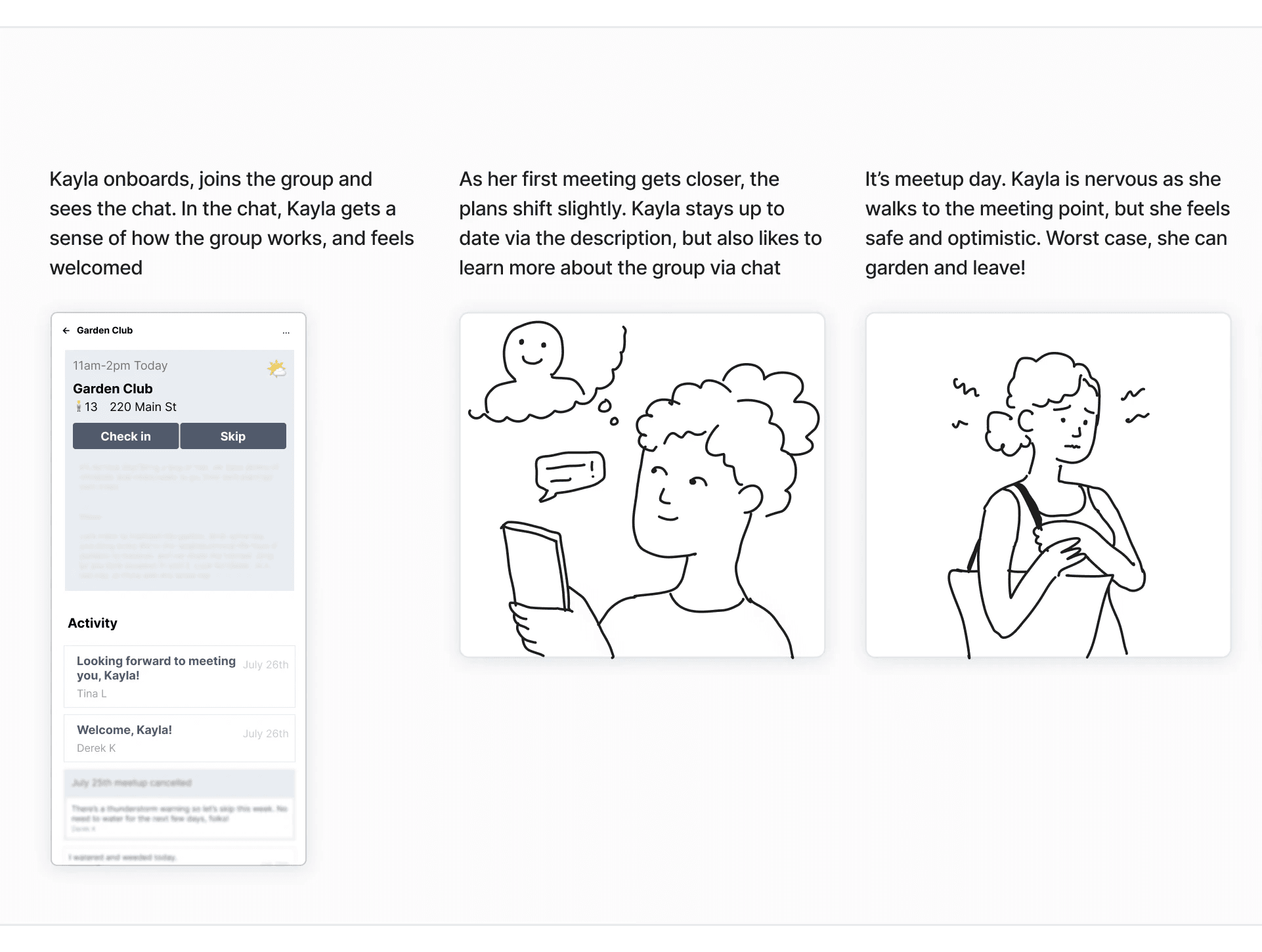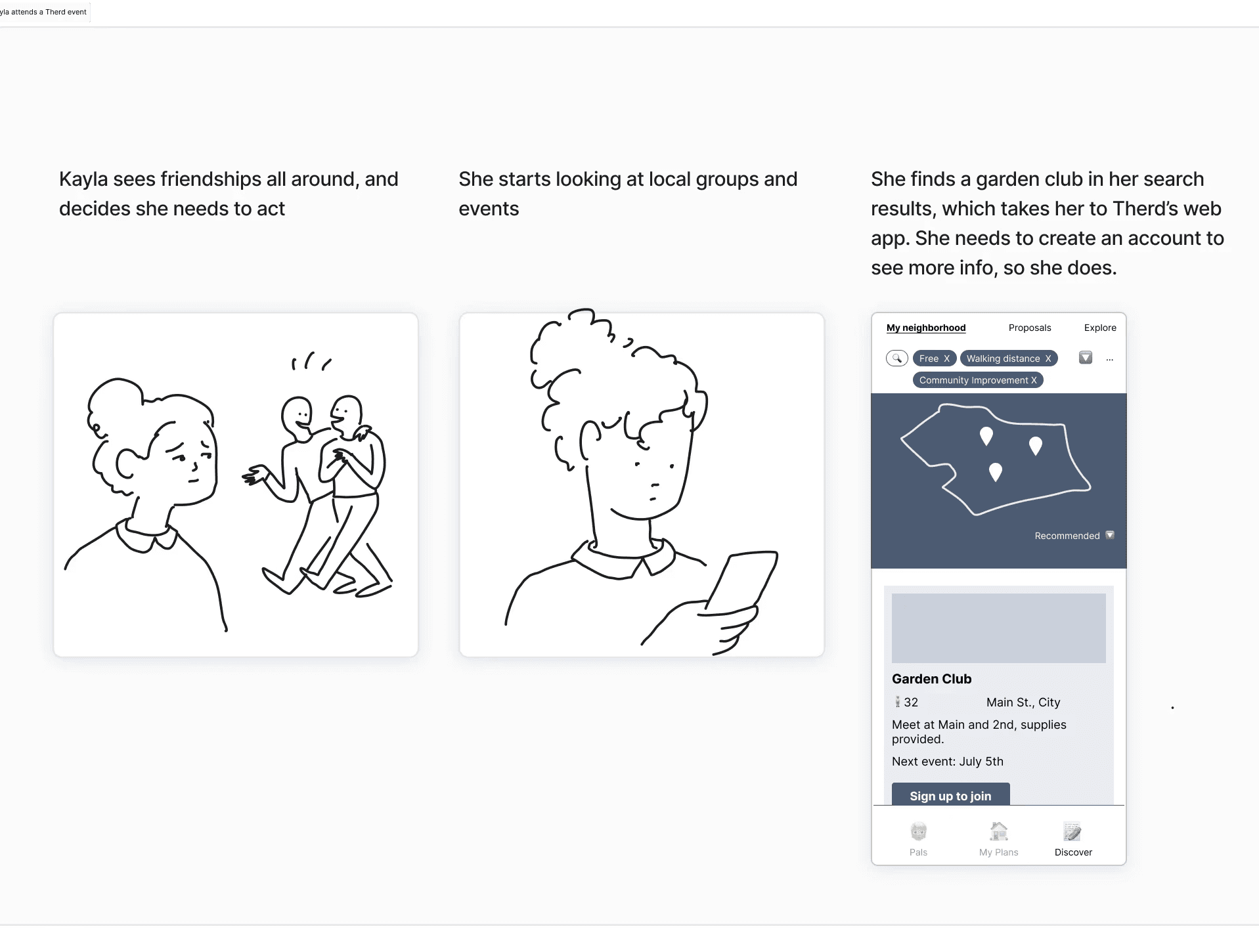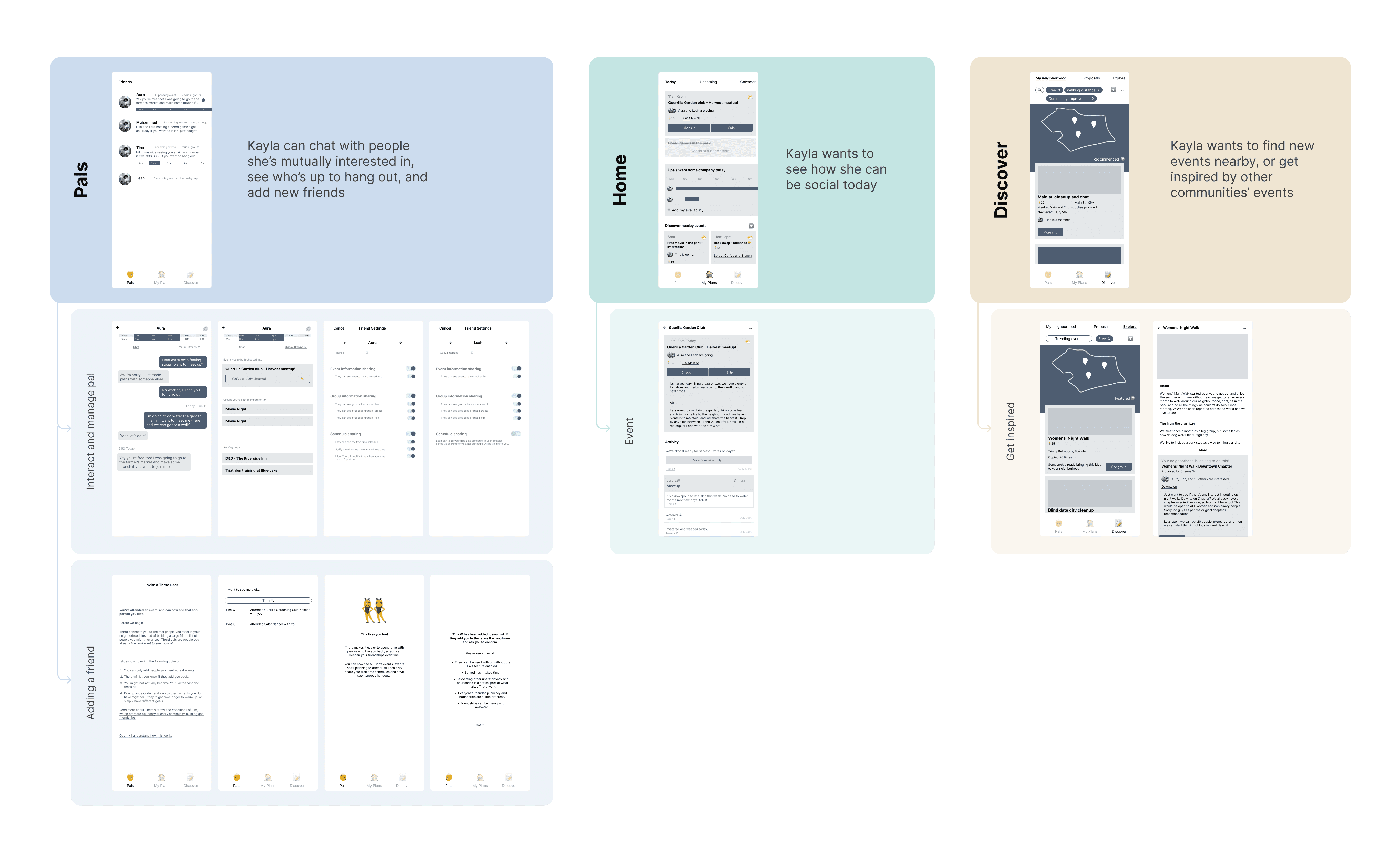 Now I had some ways to promote my desired behaviour, I started explorations. One of my favourite ways to explore ideas is through storyboard-wireframes. These help keep the context and user in mind as I explore how a product impacts their behaviour. Here, I explore how Kayla uses the app to attend an event.