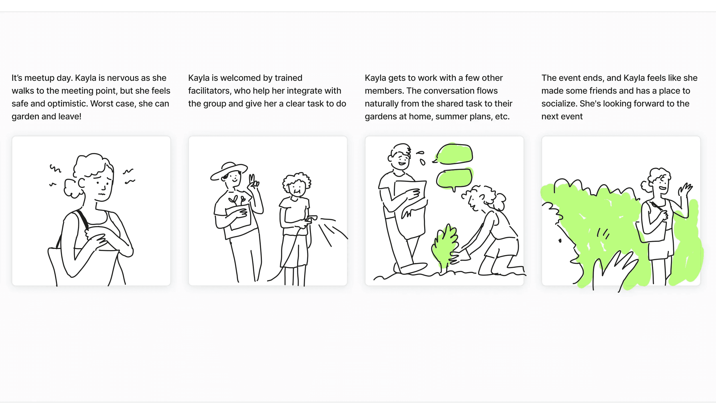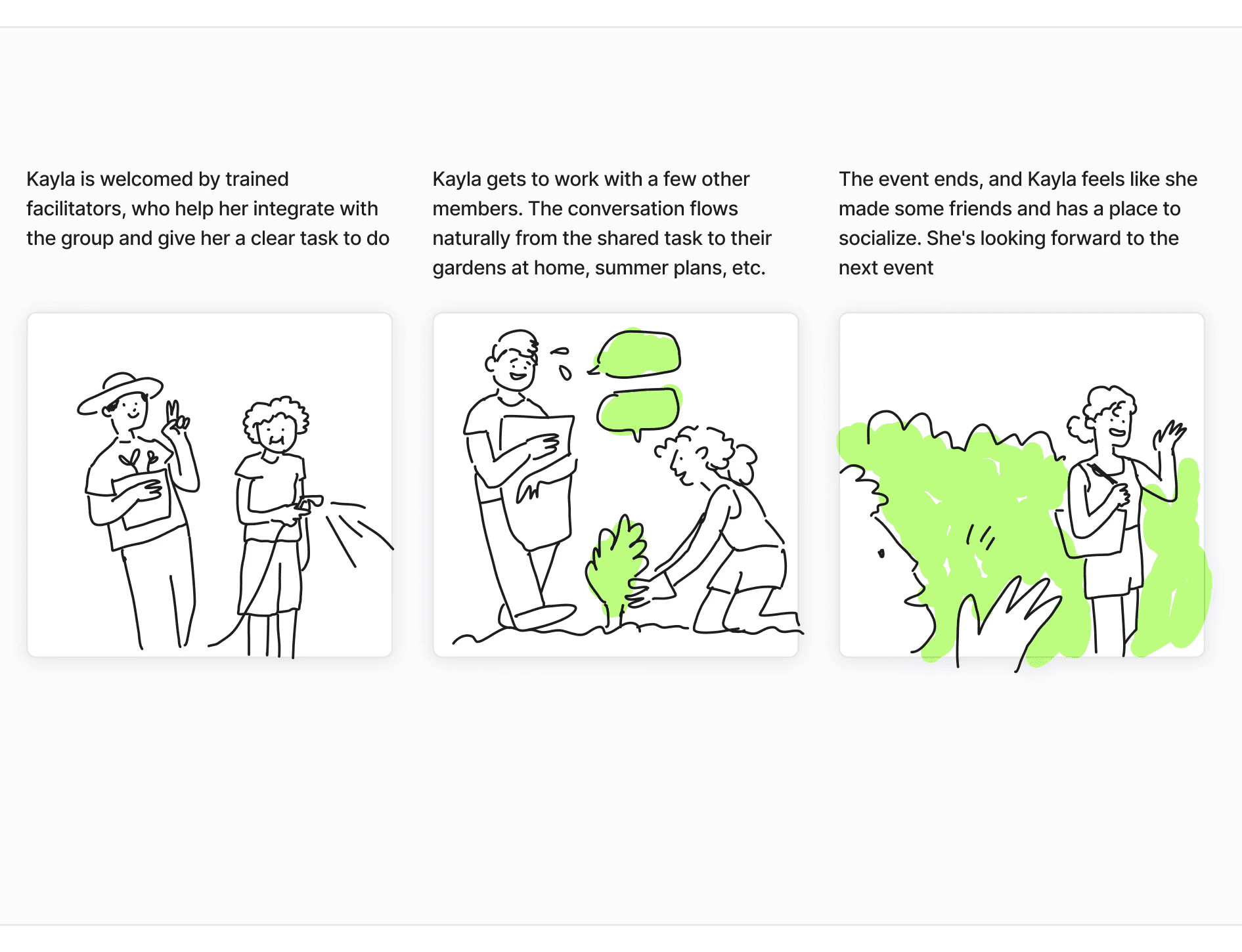 Over time, Kayla's neighbourhood becomes home to more low-barrier local events. As she attends these events, she feels a stronger sense of belonging and connection. With repeat encounters with her neighbours, Kayla builds new friendships and has fewer moments of loneliness. When she does feel lonely she attends events, heads to spaces where she can interact with neighbours, or plans to see her new friends. As her confidence raises, she explores ideas from other communities and instead of thinking "we could never do that here", she thinks "I could make this happen here!". Eventually, she decides to host her first event.