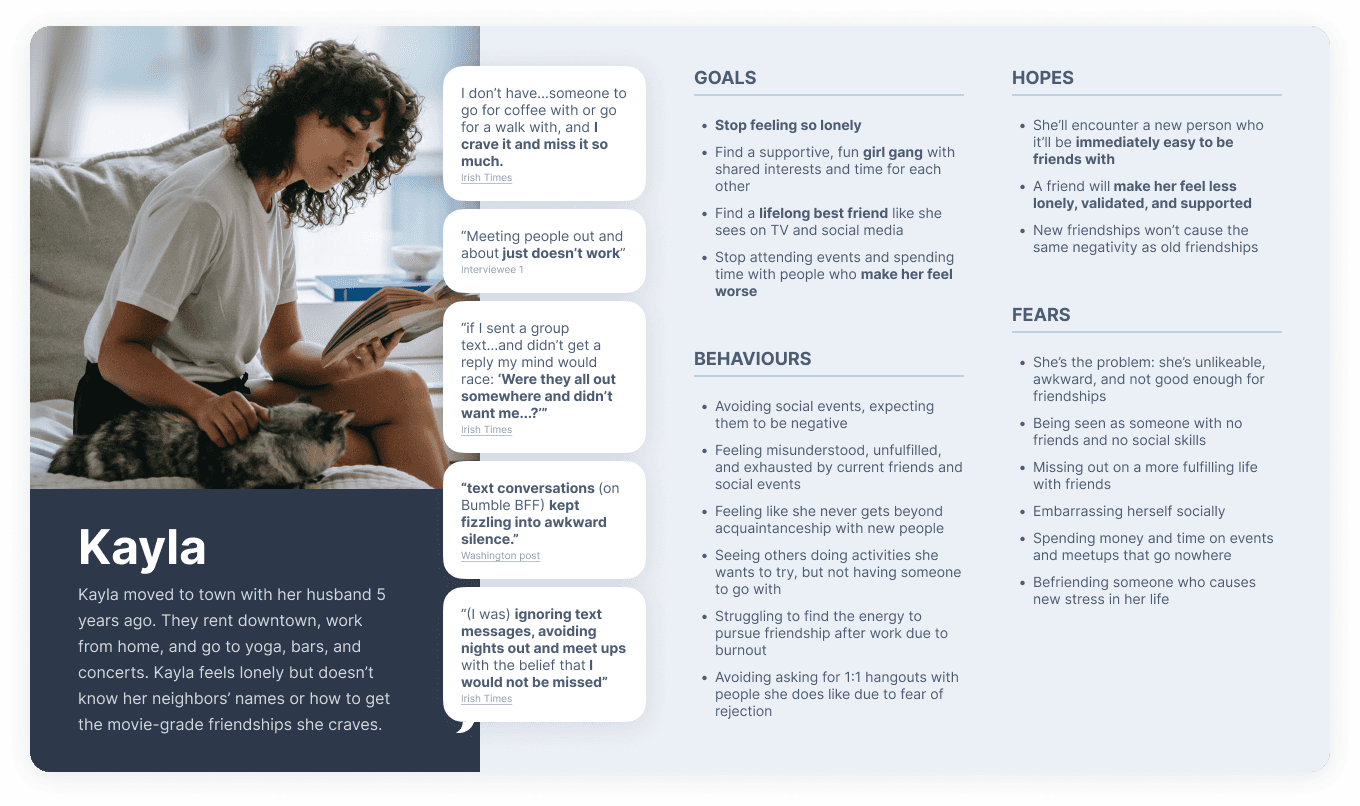 This research was summarized into a persona, Kayla, who is deeply lonely, disappointed by her previous attempts to make friends, and is seeking change.