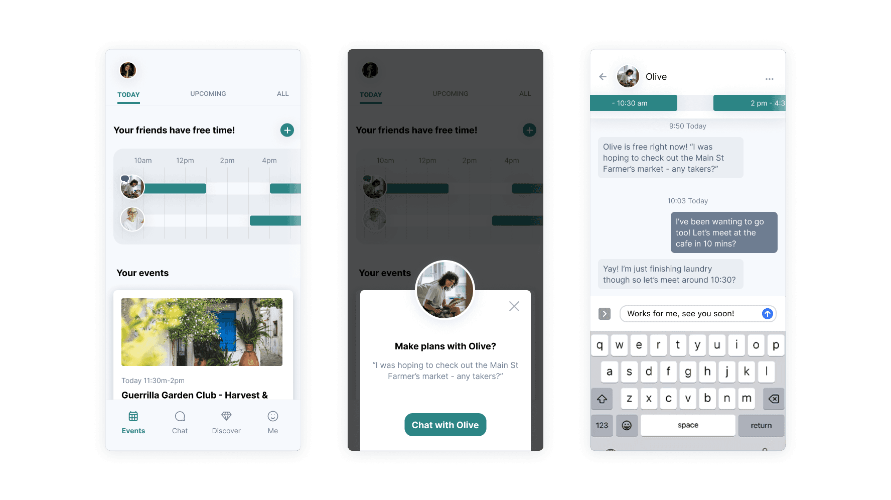 One major iteration was the removal of the in-app befriending feature which allowed users to mutually befriend the people they encountered at events, and to enter free time into the app. The feature allowed spontaneous hangouts when two friends had free time, and intended to help act on brief feelings of loneliness. However, I removed this feature due to the high risk of social harm if interest wasn't reciprocated, as well as the fact that Therd's events would already allow natural befriending thanks to its frequent casual interactions between neighbours.